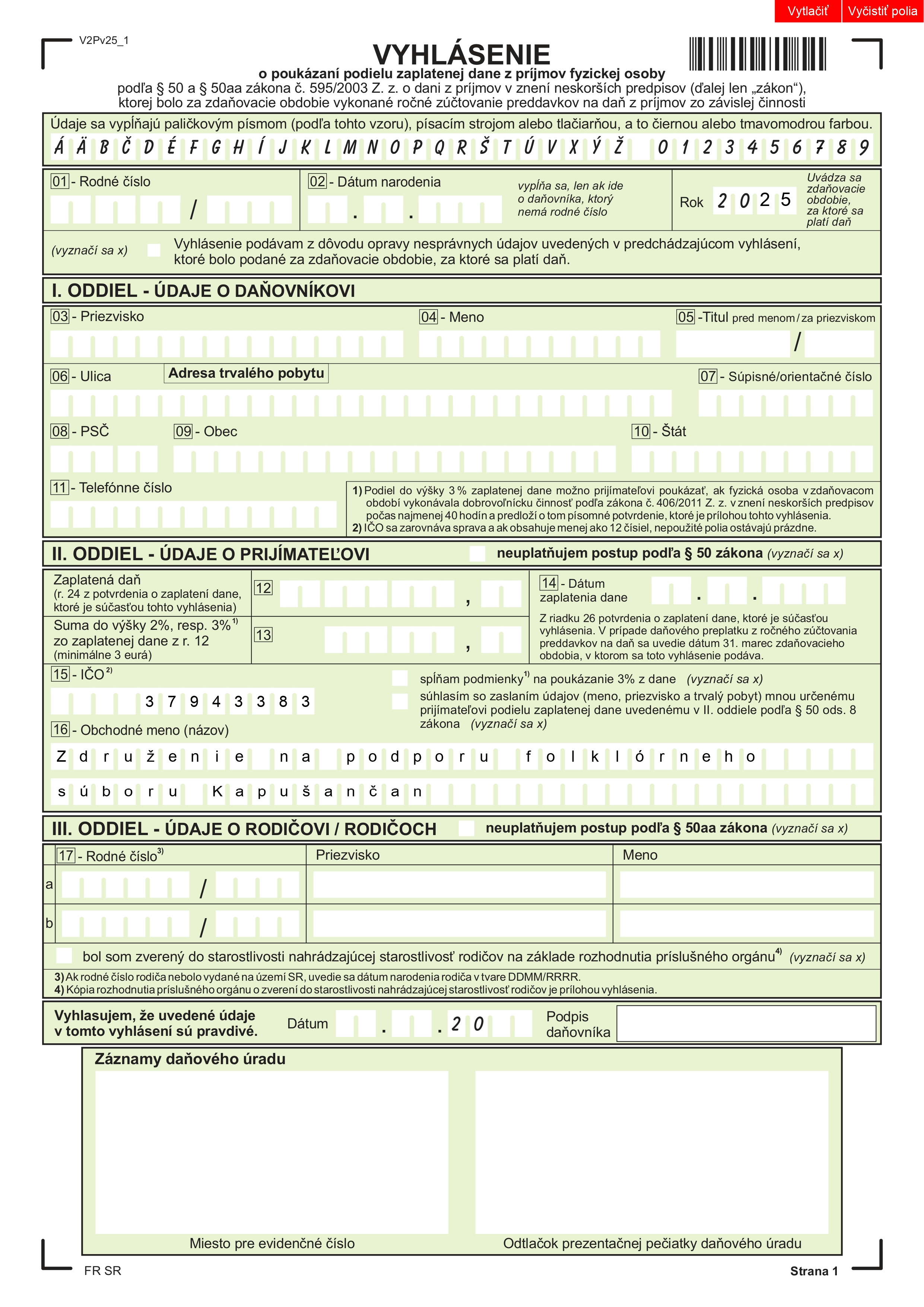 2% z Vašej dane Vyhlásenie 2025